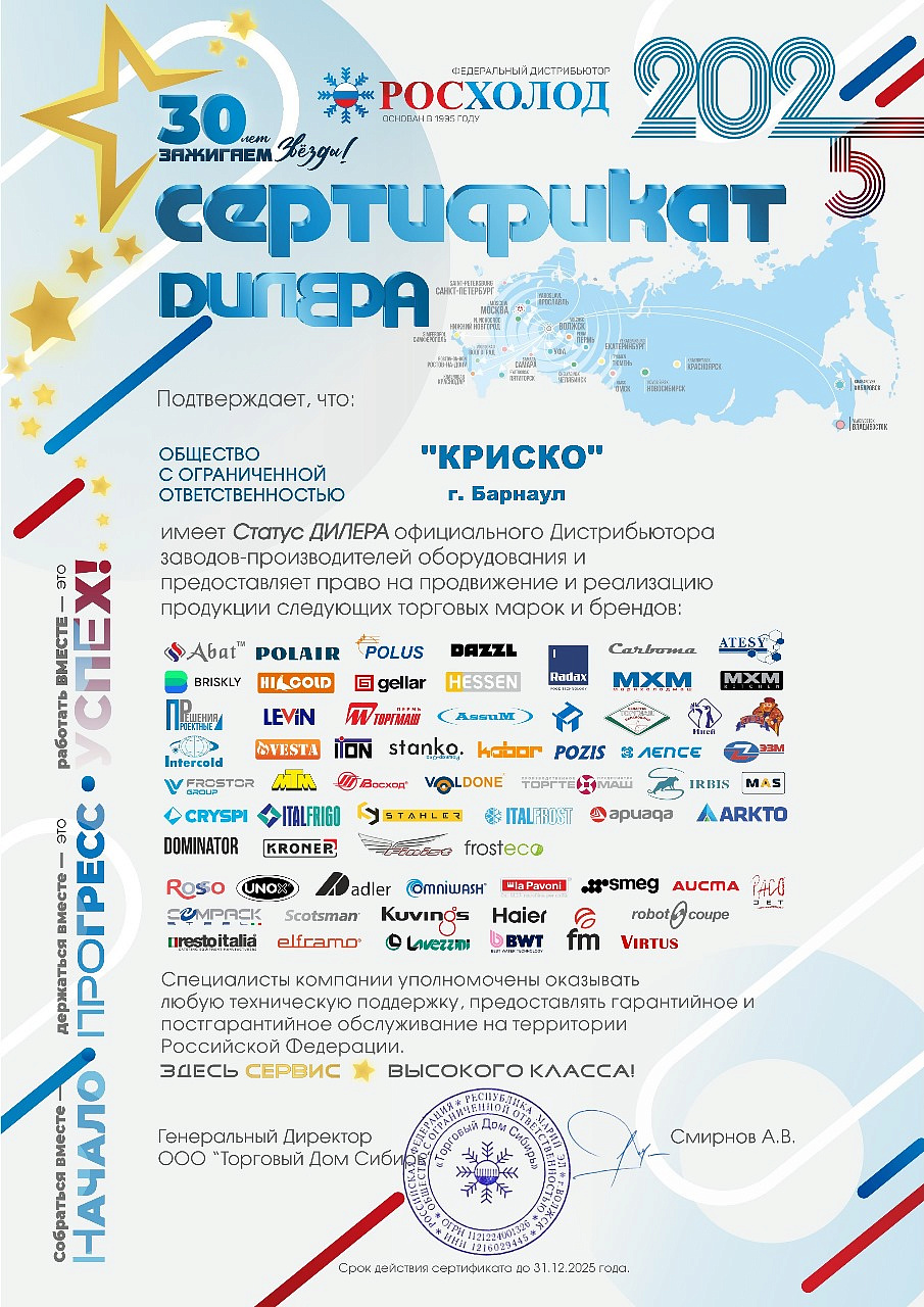 Компания "КСС"динамично развивающаяся организация, является официальным дистрибьютором как Российских производителей оборудования для предприятий общественного питания, так и представителем европейских заводов-изготовителей.